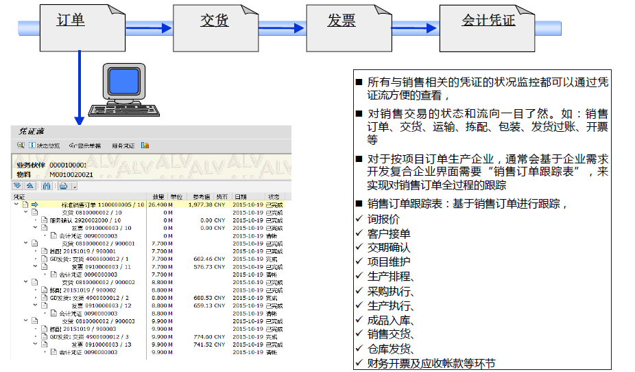 在SAP中只需要有銷售訂單,就能查詢與這個(gè)銷售訂單關(guān)聯(lián)的大部分重要業(yè)務(wù)憑證數(shù)據(jù),做到了數(shù)據(jù)的簡(jiǎn)便快捷查詢和業(yè)務(wù)數(shù)據(jù)的一體化。
