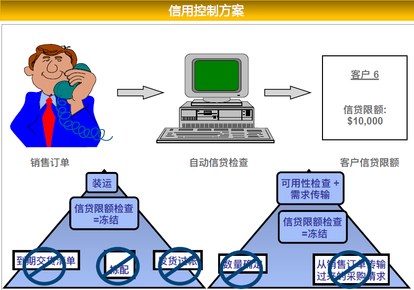 SAP系統(tǒng)提供完善的客戶信用額度控制功能,通過定義信貸控制范圍我們可以把信用控制分配到整個(gè)集團(tuán)或是一個(gè)公司代碼下,比如我們可以整個(gè)集團(tuán)是一個(gè)信用額度或者是某個(gè)公司代碼是一個(gè)信用額度。通過信貸控制,公司的應(yīng)收賬款風(fēng)險(xiǎn)就可以得到有效的控制,同時(shí)又不增加銷售人員的工作量。