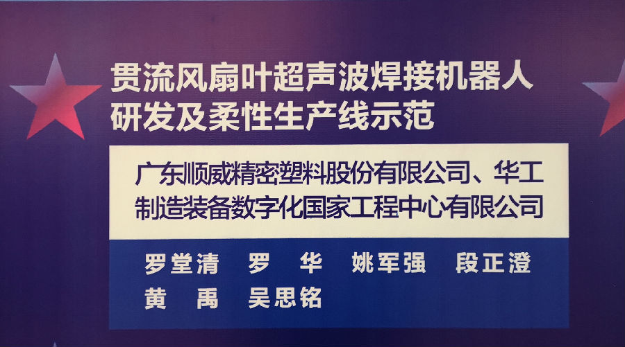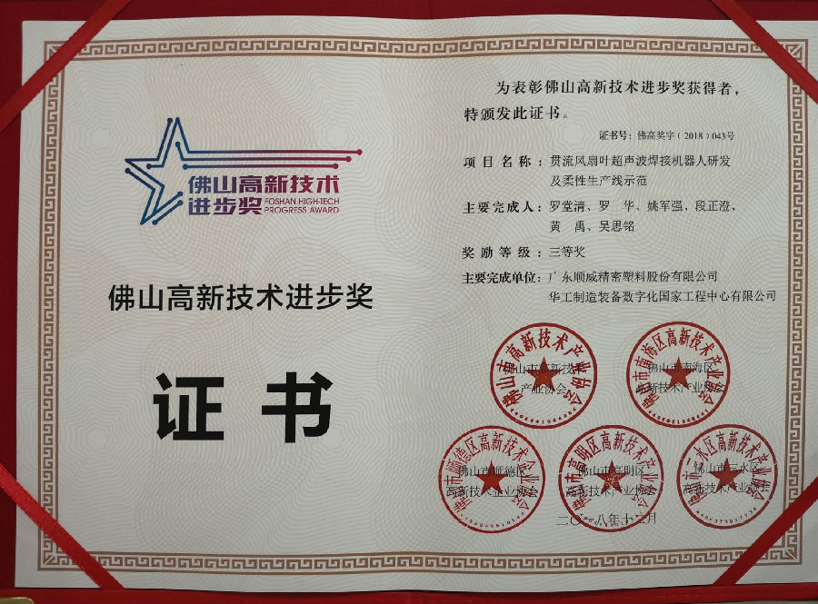 2019年1月18日,首屆“佛山高新技術(shù)進(jìn)步獎”表彰大會在中歐中心國際會議中心隆重舉行,順威股份“貫流風(fēng)扇葉超聲波焊接機(jī)器人研發(fā)及柔性生產(chǎn)線示范”項(xiàng)目喜獲三等獎。